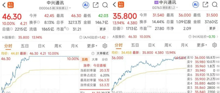 受此消息影响,中兴通讯(000063)A股今日股价高开高走,最终封住涨停板,报收46.3元/股,港股中兴通讯同样大幅上涨,最终收报35.8港元/股,涨幅13.94%,公司最新总市值已达到2111亿元。