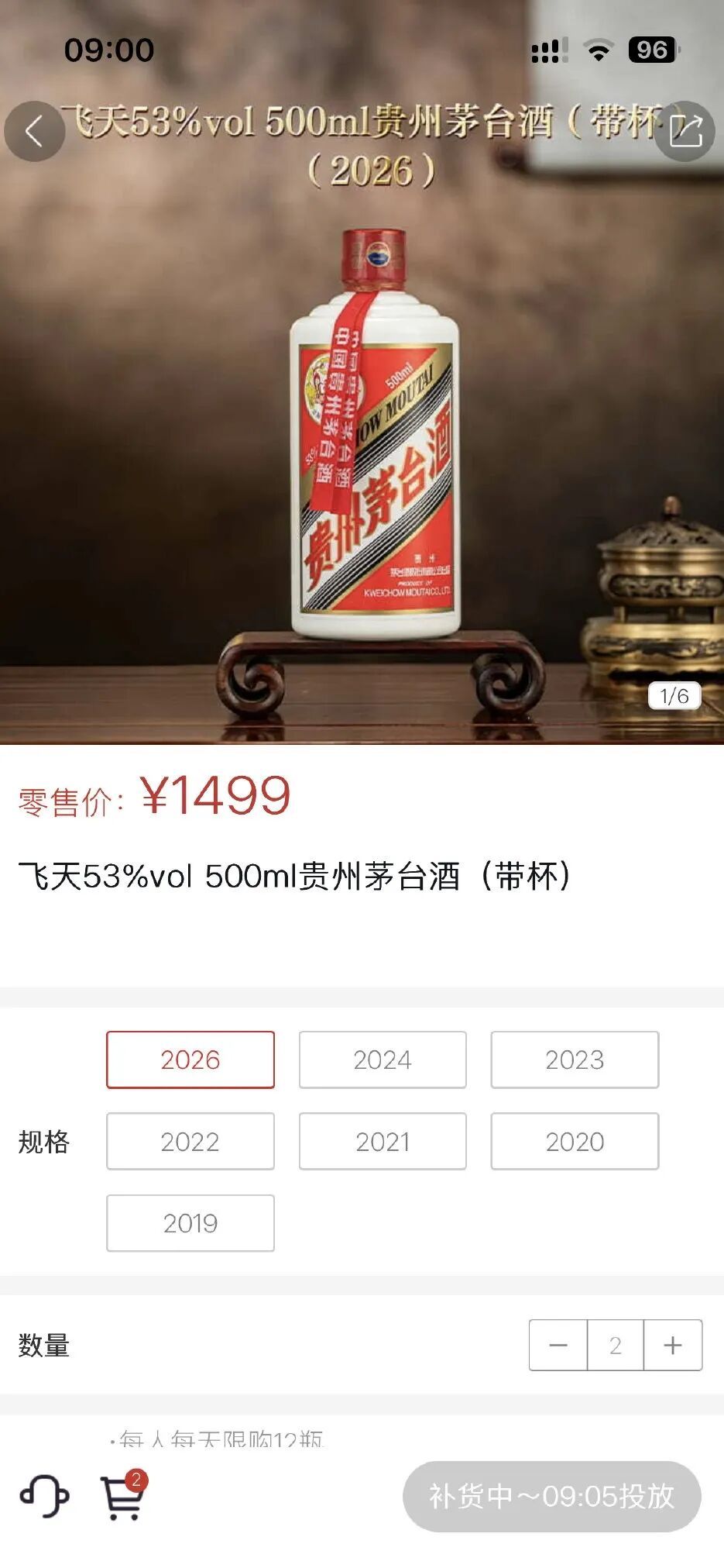 记者获悉,目前每位用户每日最多可购买12瓶,每日投放量会综合考虑防止炒作、供需适配和市场稳定确定,当日售完即止。此后,每日上午9时都将准点开售。